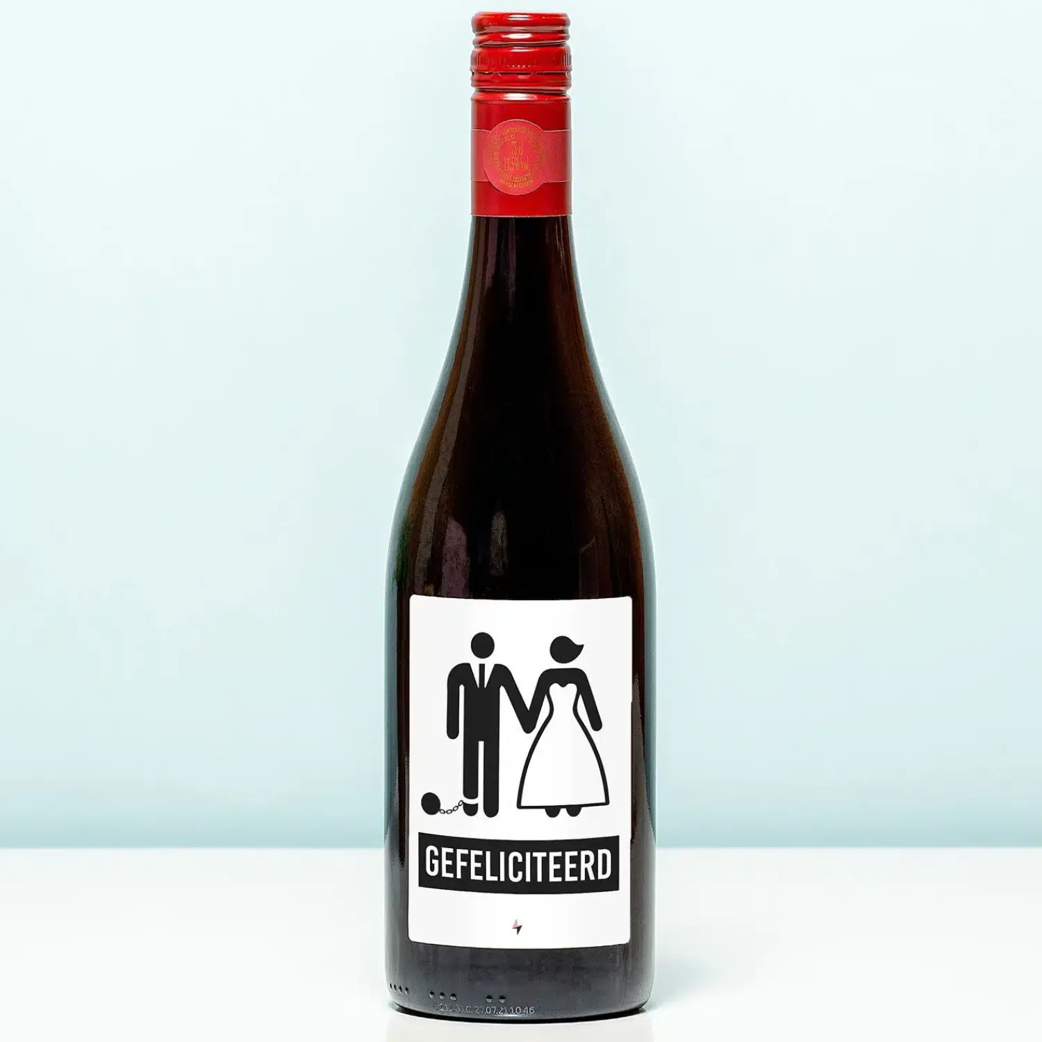 Het is vreselijk achterhaald om te doen alsof het huwelijk een gevangenis voor mannen. Maar dat wil niet zeggen dat je je beste vriend, broer of collega er niet mee kunt plagen. De Wijnfles Game over Bruidspaar bevat een grappig etiket. Je ziet een bruidspaar, waarbij de man een enkelboei draagt. Daaronder staat de tekst: gefeliciteerd. Een geinig cadeautje om aan het toekomstige bruidspaar te geven, bijvoorbeeld op het vrijgezellenfeest of op het huwelijk.