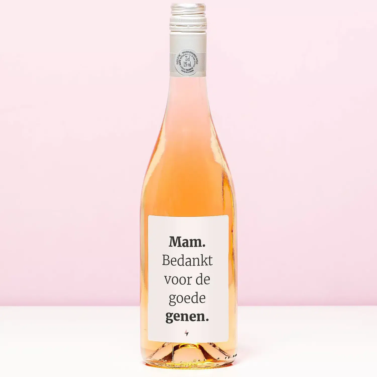 Wat is er nou een groter compliment voor je moeder dan te zeggen dat je zo blij bent met haar goede genen? De Wijnfles Mam, bedankt voor de goede genen doet precies dat. Eigenlijk bedank je haar dus dat jij zo leuk bent geworden. En daar zal ze het ongetwijfeld mee eens zijn. Een leuke fles wijn, voor bijvoorbeeld Moederdag of haar verjaardag.