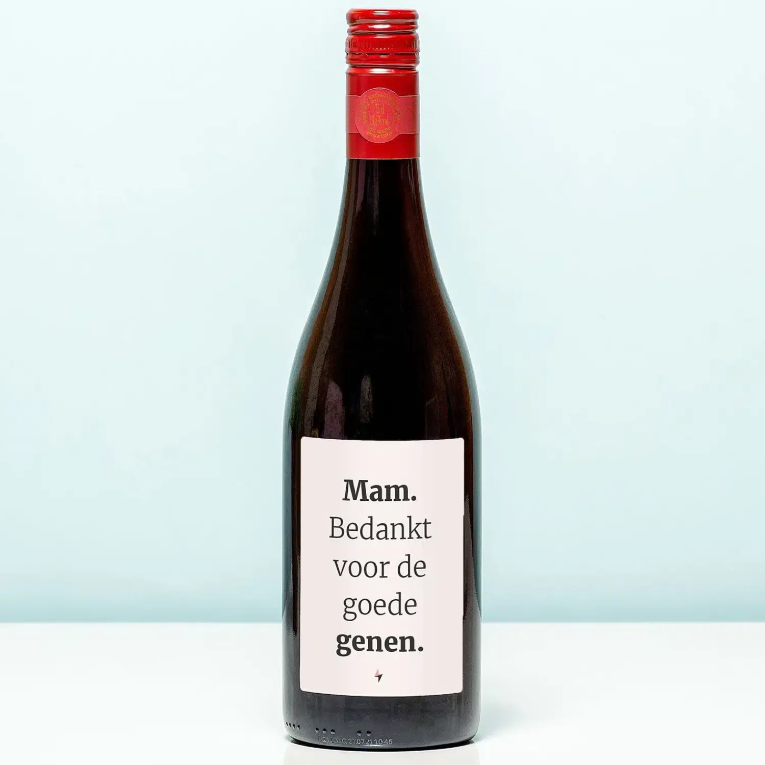 Wijnfles met tekst Mam, bedankt voor de goede genen